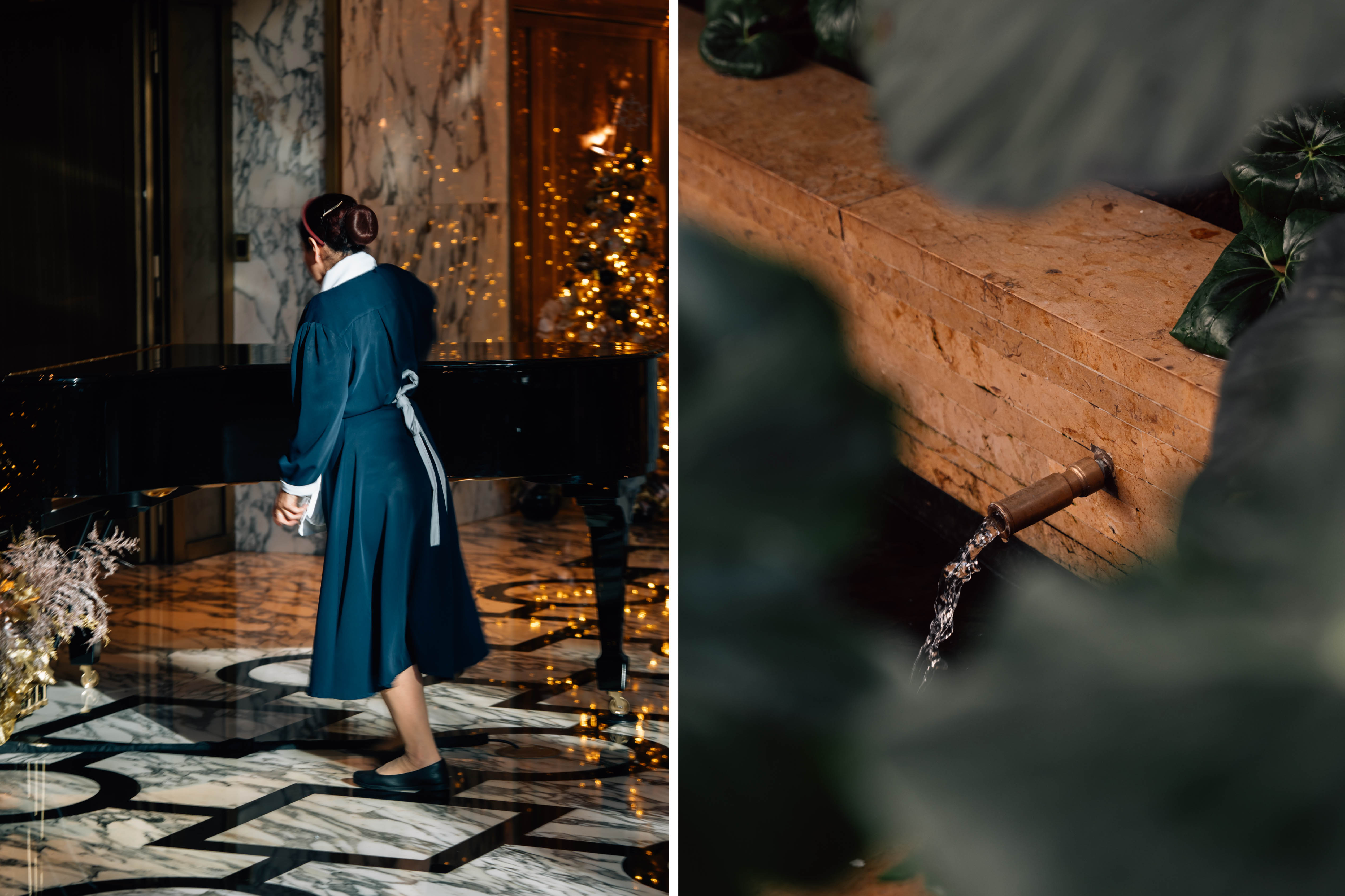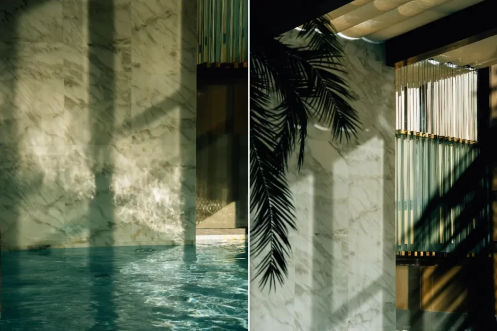 Standing in the central courtyard, I often forget that I am in Morocco. What unfolds before me feels closer to New York, Paris, or London, or perhaps to a remembered idea of the international city, shaped less by geography than by longing. Soft marble stretches across nearly all the public spaces, while light descends from above in slow, shifting patterns. Staff members, dressed in variations of 1950s style uniforms, move quietly through the space with restraint and care. At certain moments, there is the faint presence of jazz in the air, not as sound but as memory, like a private assurance that somewhere in the past, things once felt possible.